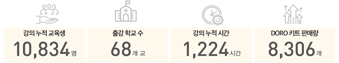 DORO의 교육은 쌍방향 소통을 전제로 직접 제작물을 만들어 소장하게 하는 DORO 키트를 제공한다. 이론과 기술 교육을 적용해 자신의 손에서 만들어지는 제작물은 청소년들에게 좋은 추억이기도 하지만, 진로에 대한 동기부여로 연결되어 만족감을 증폭한다.