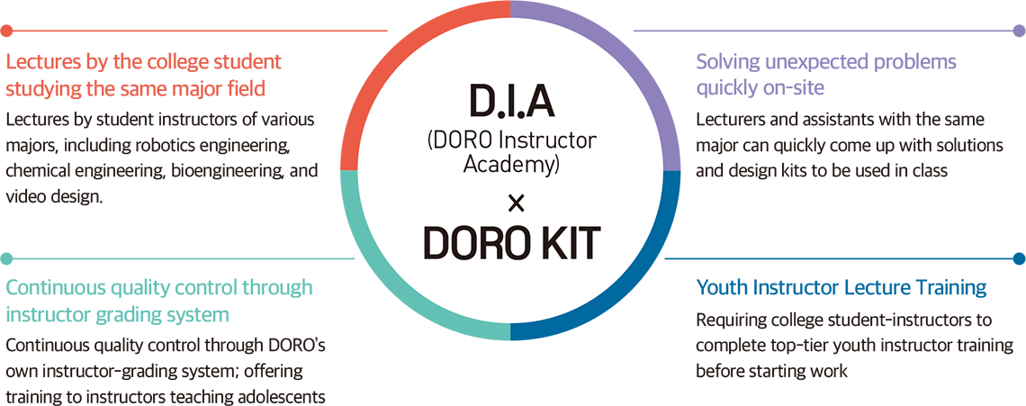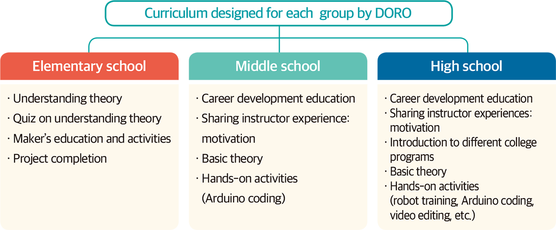 The market economy is being reorganized and as a result, sociocultural changes are rapidly progressing. Subsequently, it is necessary to expand and diversify career fields beyond compulsory education and entrance exam-oriented education for the future workforce. DORO is an engineering education group mainly composed of 3rd and 4th year college students. It provides customized curricula for elementary, middle, and high school students and is dedicated to increasing accessibility to 4th Industrial Era technologies. For elementary school students, the focus is on generating interest through activities like kit-making. For middle and high school students, activities related to career building are offered to stimulate active participation from students. To do so, DORO works to build an educational culture that applies artificial intelligence and robots to the future.
