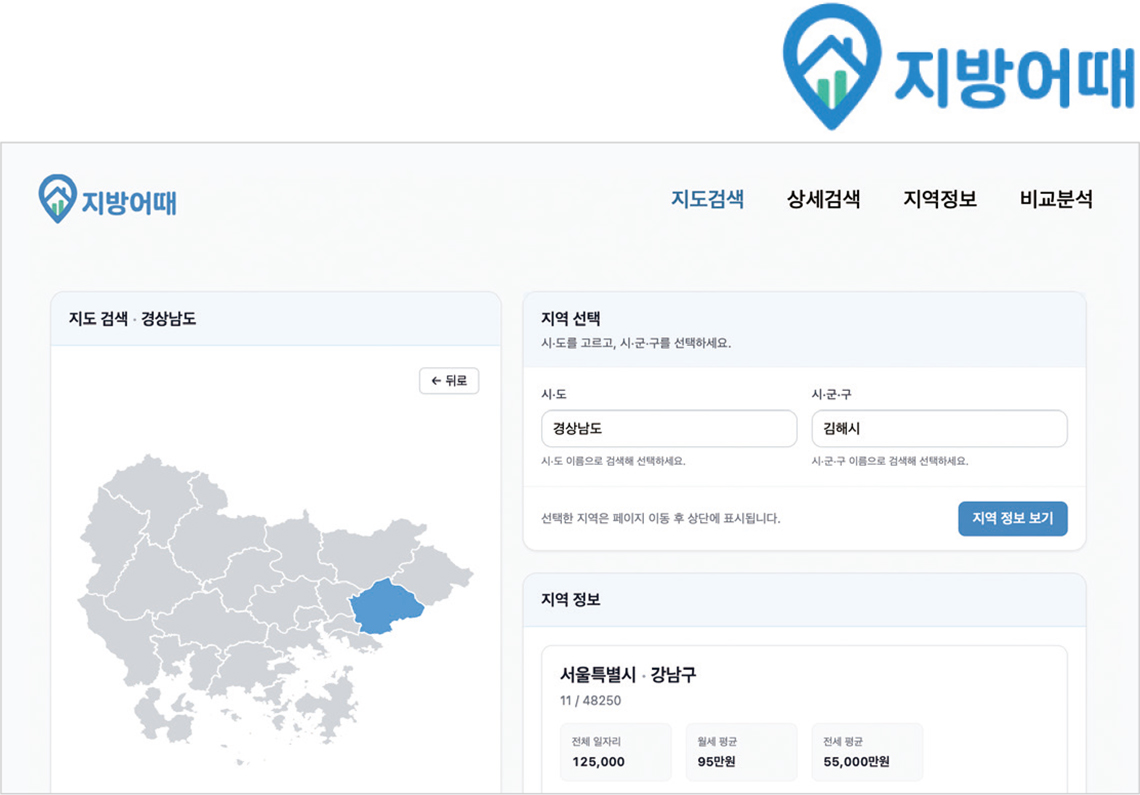 진범. ‘지방어때’는 청년들이 지방 이주를 고민할 때 겪는 가장 큰 문제인 정보 탐색 비용을 줄이기 위해 개발한 플랫폼입니다. 지자체 및 기관별로 흩어져 있는 지원 정책이나 정보 등을 한곳에 모아 한 화면에서 비교할 수 있도록 구성했습니다. 주거비, 직종별 채용 공고 등 사용자 조건에 맞춰 후보를 빠르게 좁힐 수 있도록 설계해 의사결정에 필요한 시간과 반복 검색의 불편을 덜어준 것이 장점입니다. 대회 현장에서는 ‘직접 사용해 보니 바로 이해가 된다’, ‘정보를 찾는 흐름이 자연스럽다’는 평가를 받았습니다. 전반적으로 반응이 가장 좋았던 부분도 사용자 경험과 지역 간 비교 및 탐색의 흐름이었습니다.